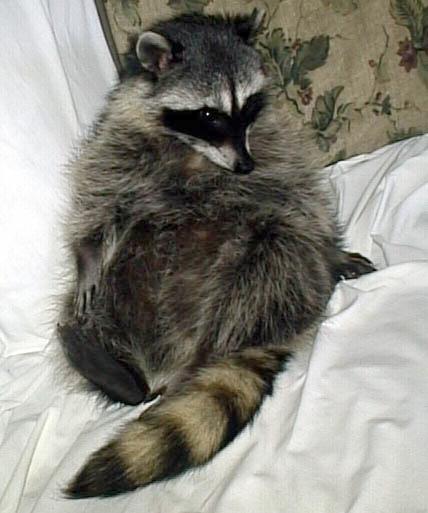 "I had to sneak in "Dad's" office and borrow his computer to send you this update. My brother and sister, Pistol and Pandemonium are doing fine in the wild and come to visit me in the house every night. My sister Panda got run over by a car and I got my rear foot broken in the same accident. It took me two days to crawl home, so "Dad" is letting me stay in the house until i heal up. My foot is a little crooked but i am back to running and climbing again. I feel safer sleeping in my house in the kitchen cabinet during the day and playing with the outside coonies at night. I have 26 friends to choose from. Hope "Dad" got the translation right. Non pet Cubby" |