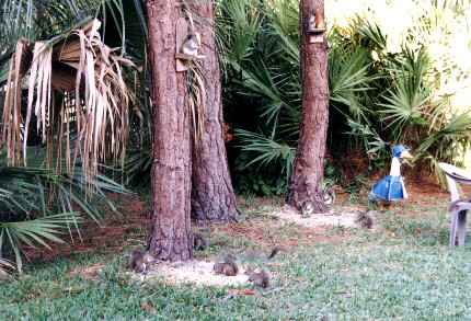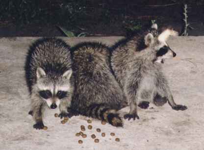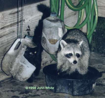 Spooky is a wild kitten that has been visiting John's feeders for the past 3 months and been observed arriving with the raccoons, eating with them, and leaving with them. Right now, the kitten "wants absolutely NOTHING to do with humans" but John and his wife Judy are hoping that Spooky "will get tame enough that we can catch him (or her) and take him (or her) to a vet for shots, etc."