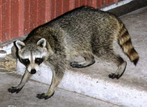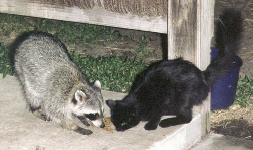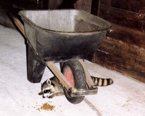 Wrong. Sam somehow noticed there was food by the wheelbarrow, and sneaked under to get it. I don't know how he has that figured out, but he seems to know the kitty food isn't really for him. One could soon spend burkew bucks buying kitty food for the coons. Fifty lb. of dog food per week is enough, already! So Sneaky Sam knows he/she is a sneak! But that kitty food is just too good. Shy Annie also occasionally snatches some of the kitty food, but she prefers the dog food, as do the rest. Sneaky Sam