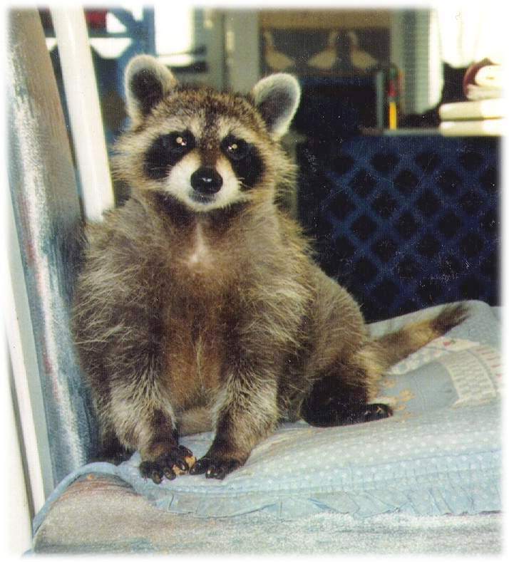 many raccoons but Pooh was my first winter one I had because he was born in Oct .He was taken out of a attic,when some workers found him all alone and almost gone He is very cute and, at 45 lbs. at release, a little fat too. He loved bologna. He is now released into the wild where I hope he lives a good life with all his many friends. I LOVE YOU POOH!!!!!!!" - Maureen (Rakkoonie) |